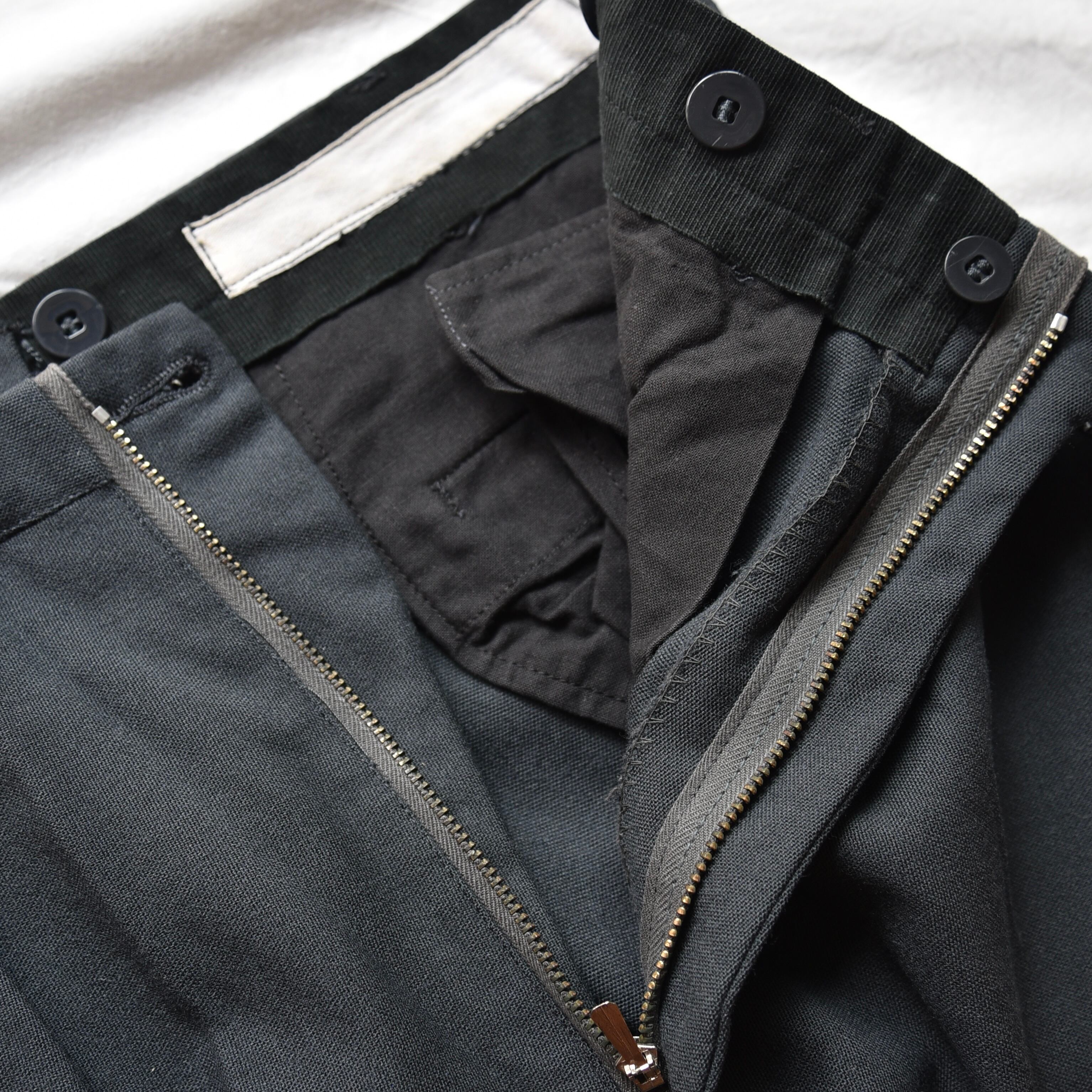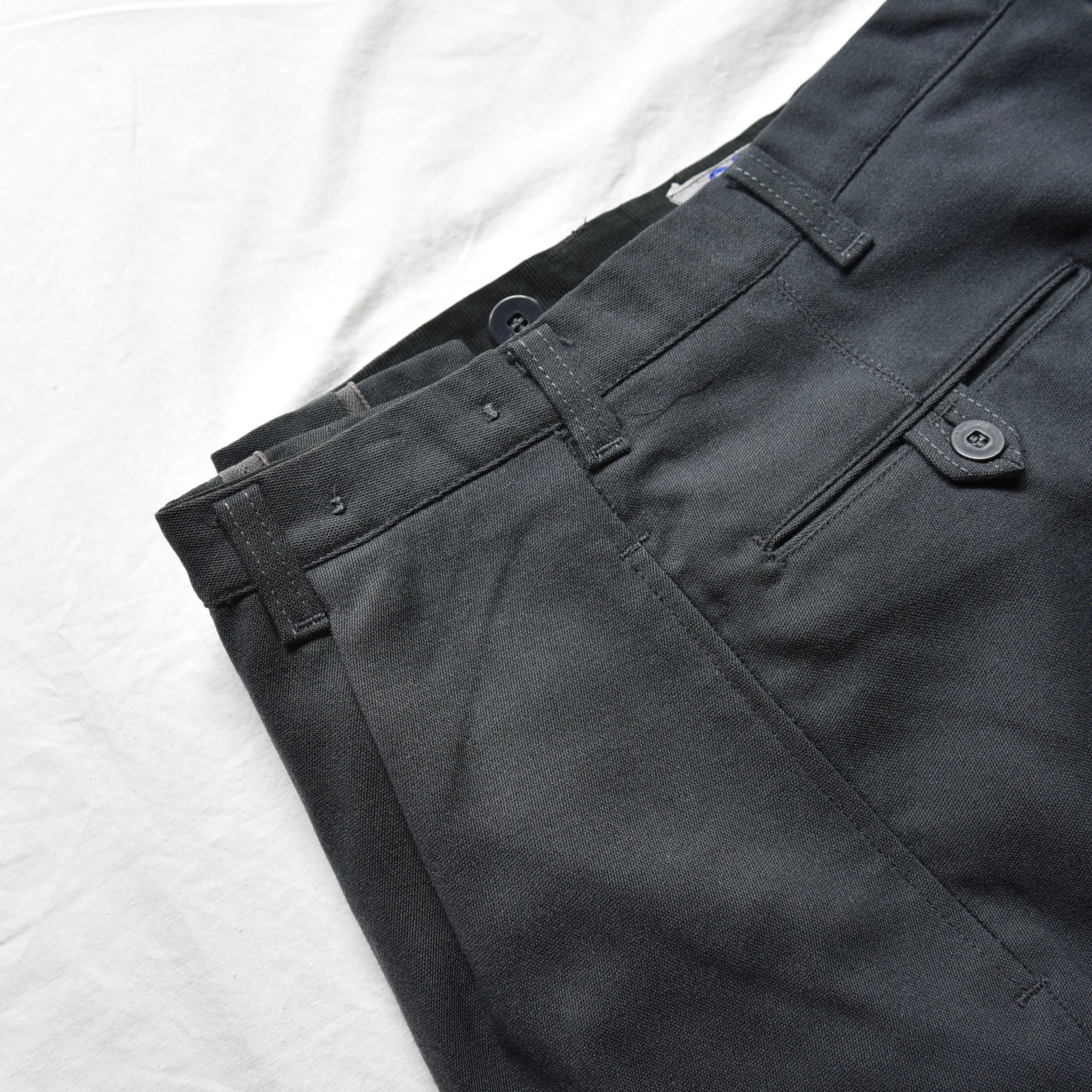 サイドにはスラッシュポケット、バックは両玉縁ポケット付き。