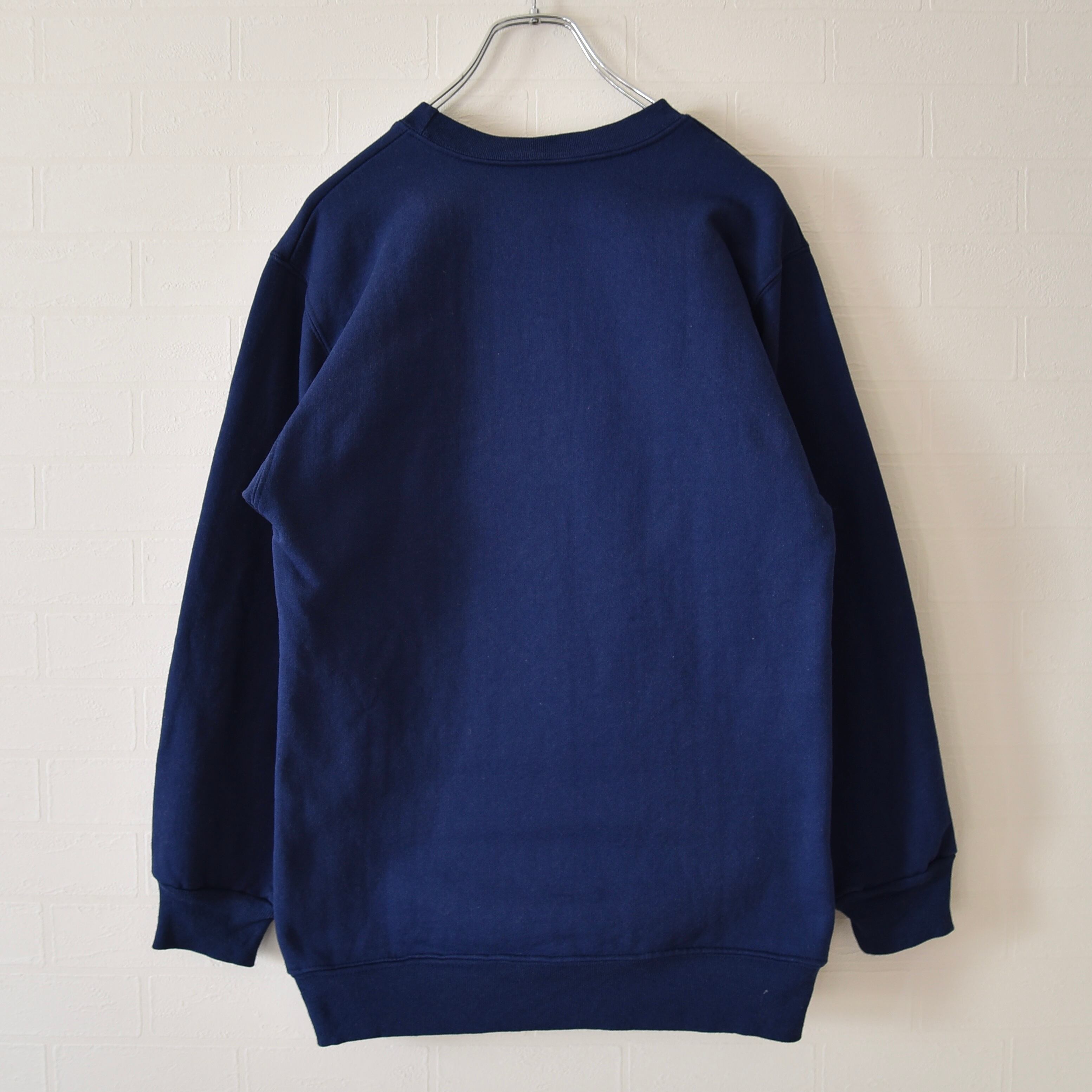 アメリカ製で、ガッシリと厚い生地、裏起毛、濃紺な色合いが特徴のスウェットシャツ。