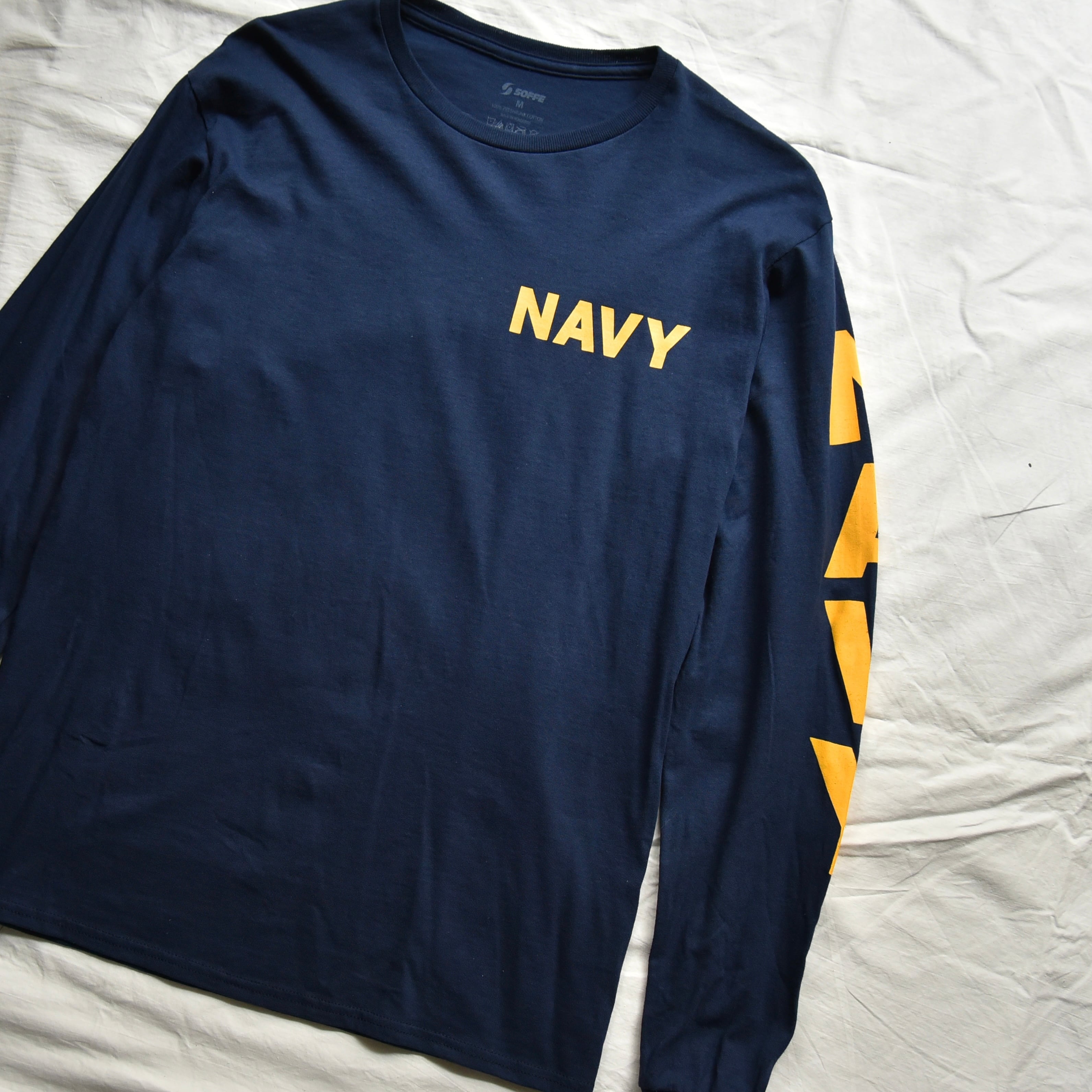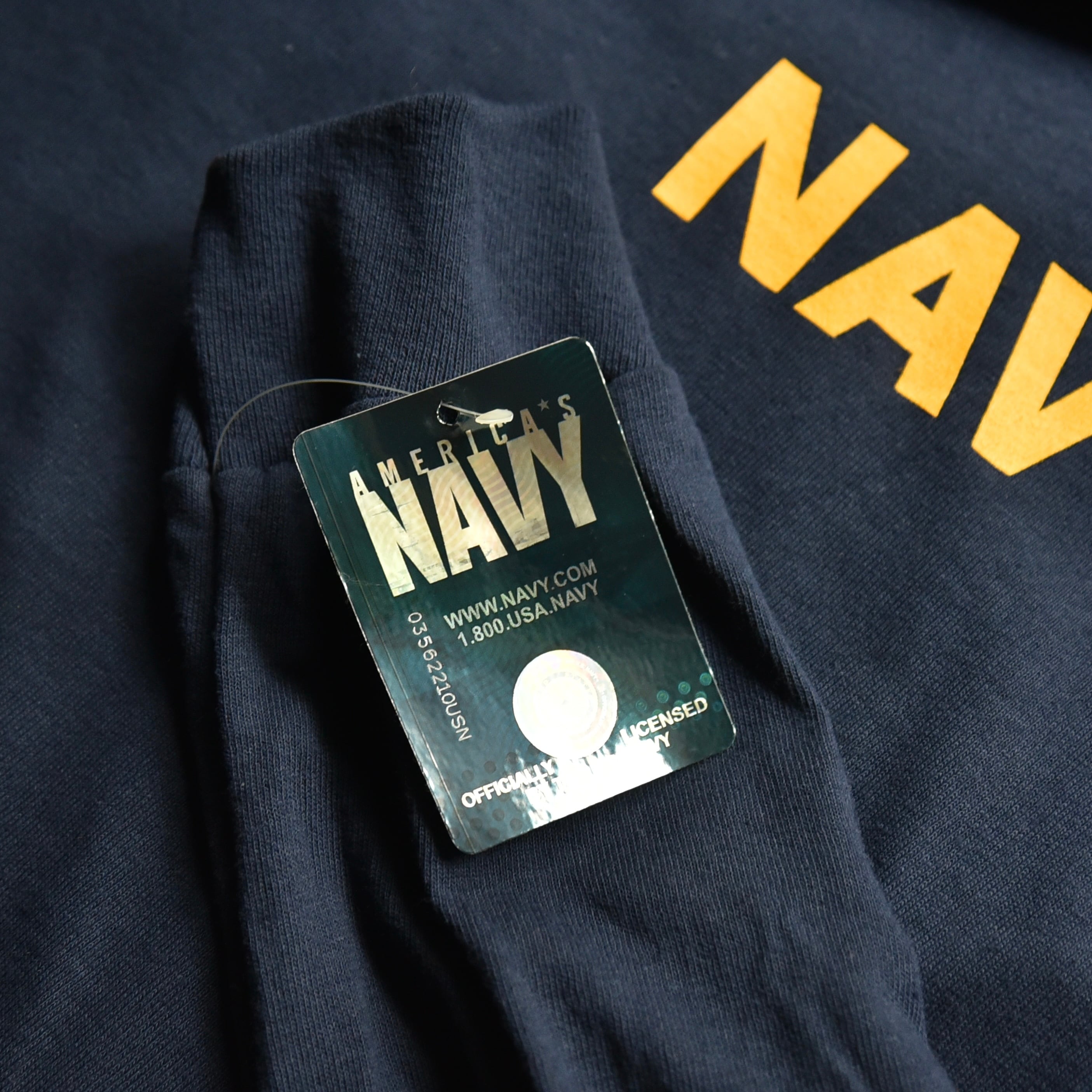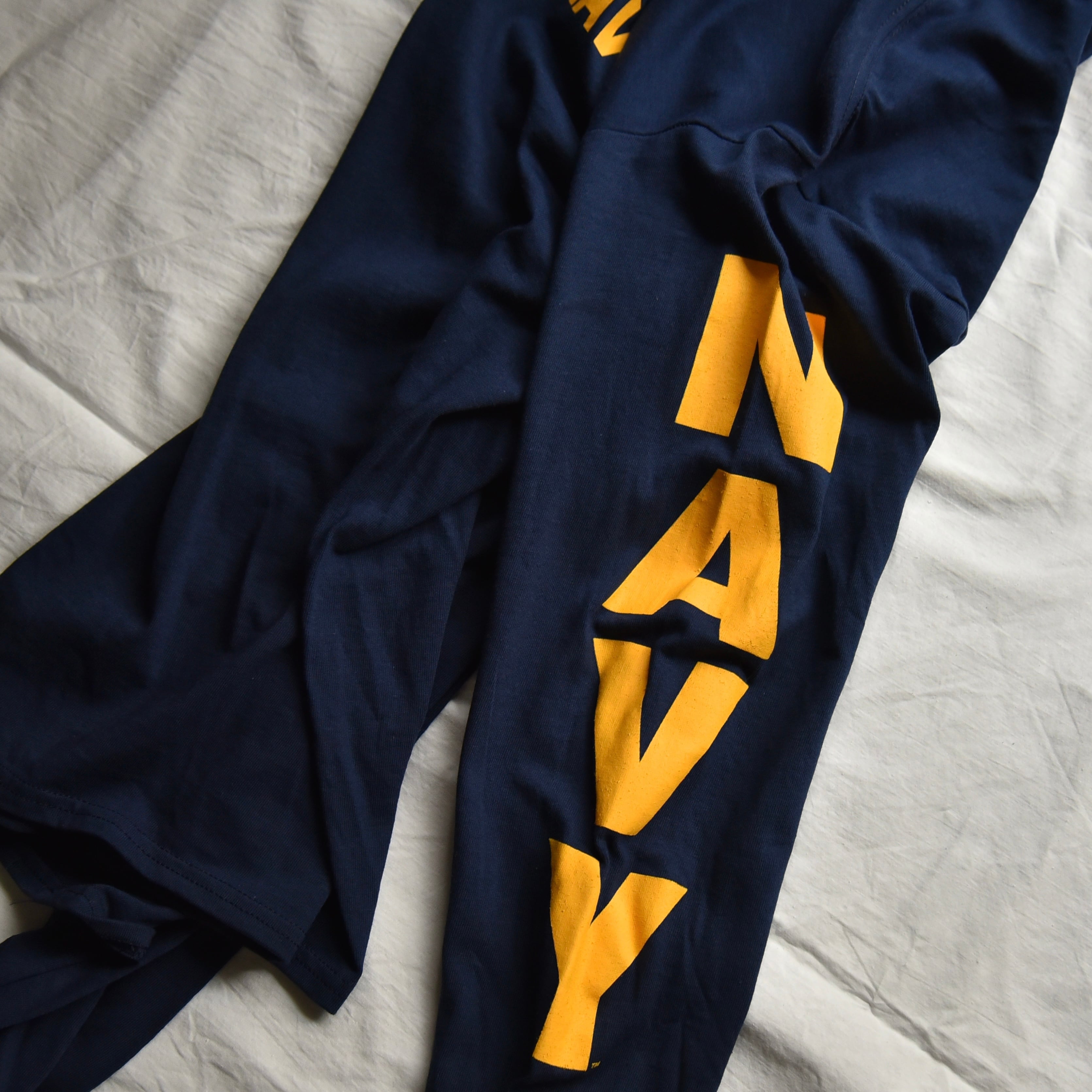左袖には大胆に入る「NAVY」プリント。
