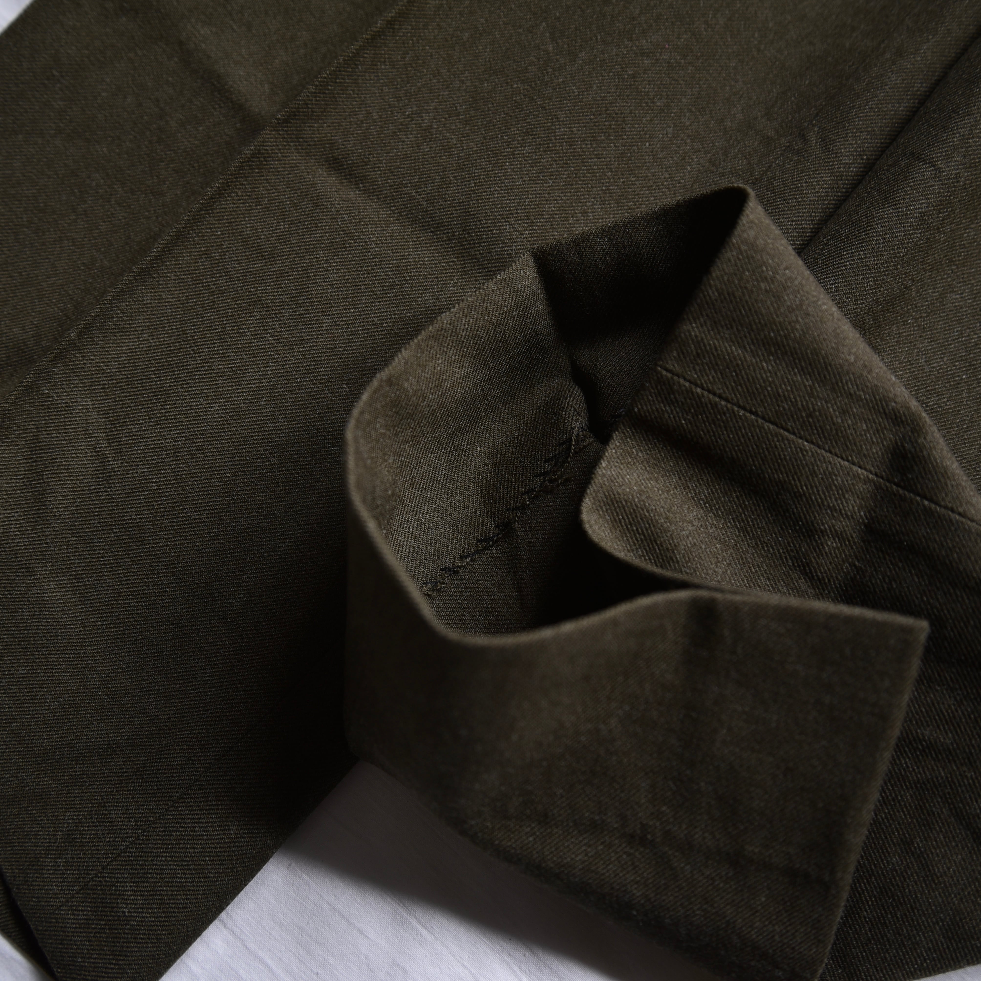 ギャバジン織りの高密度ウールポリ混紡生地を採用。